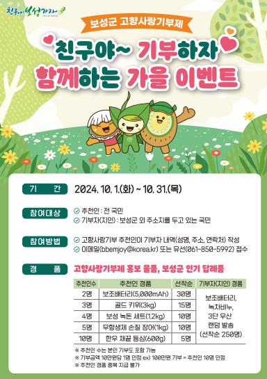 이번 이벤트는 10월 한 달간 보성군 고향사랑기부제 지인 추천을 한 추천인과 추천을 받은 기부자에게 인기 답례품과 소정의 홍보 물품이 선착순으로 증정되는 것이다.