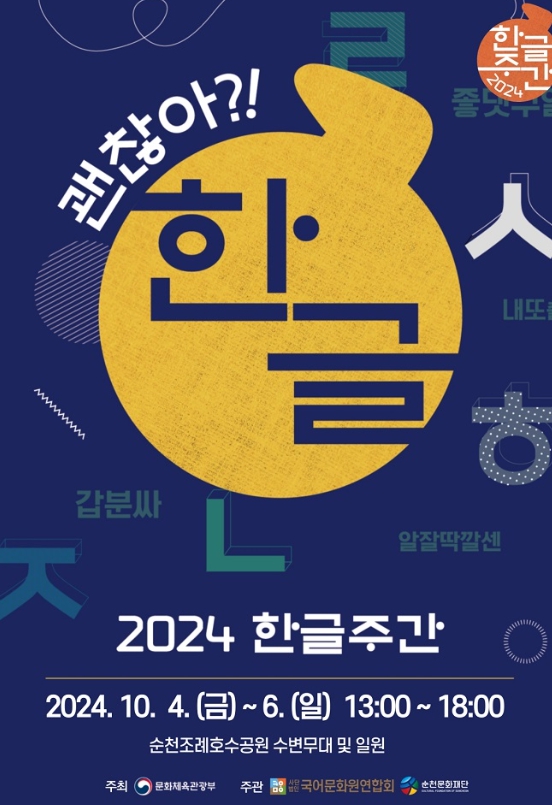 ![]() (재)순천문화재단, ‘2024 한글주간 문화예술행사’ '괜찮아?! 한글' 개최 |