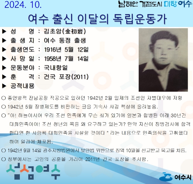![]() 10월의 독립운동가로 여수 동정 태생 ‘김초암(金初岩) 선생’을 선정했다. |