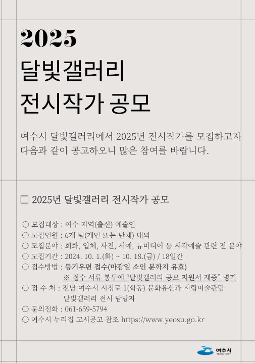 ![]() 여수시, 2025년 달빛갤러리 전시 작가 공모 |