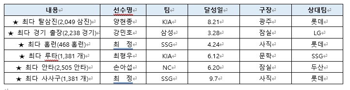 SSG 최정은 4월 24일 롯데와의 경기가 펼쳐진 사직에서 5회, 개인 468홈런을 완성하며 최다 홈런 신기록을 작성했다. 6월 12일에는 KIA 최형우가 문학에서 SSG를 상대로 5회 안타를 쳐내며 개인 통산 최다 루타 신기록을 4,078루타로 갈아치웠다. 두 기록 모두 종전 이승엽(전 삼성)이 보유하고 있던 기록이었다.