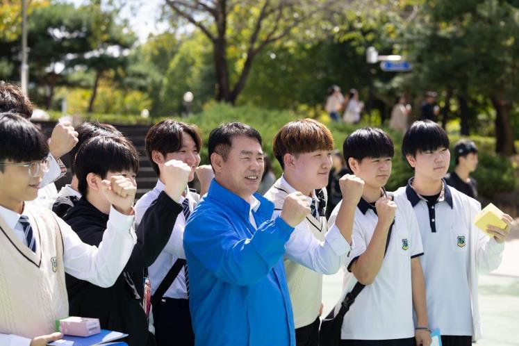 ![]() '2024년 찾아가는 공직박람회'를 찾은 이정선 교육감과 학생들 단체사진 |
