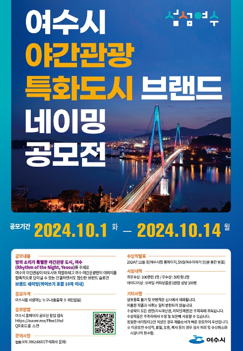 공모 주제는 ‘밤의 소리가 특별한 야간관광 도시, 여수(Rhythm of the night, Yeosu)’로, 여수 야간관광만의 이미지를 함축적으로 담아낸 간결하고도 참신한 문구를 모집한다.