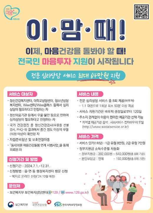 지난 7월 1일부터 시행하고 있는 전국민 마음투자 지원사업은 우울·불안 등 정서적 어려움이 있는 국민에게 대화 기반의 전문 심리상담 서비스를 제공하는 사업이다.
