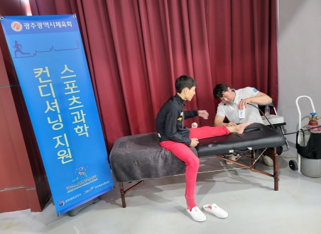 ![]() 광주광역시체육회 스포츠과학연구원 직원이 제104회 전국체전 출전 선수에 대한 회복 컨디셔닝을 지원하고 있다(광주시체육회 제공). |