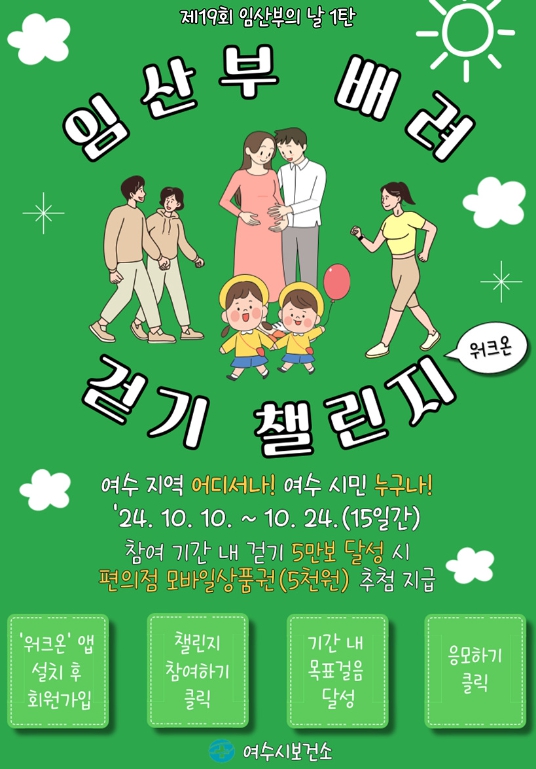 이에 여수시는 오는 10일부터 24일까지 15일간 ‘워크온’ 앱을 통해 ‘임산부 배려 걷기 도전 잇기(챌린지)’를 운영한다.
