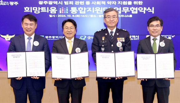 광주광역시는 8일 시청 비즈니스룸에서 광주광역시교육청, 광주경찰청, 사회복지법인 굿네이버스 등 4개 기관(단체)과 ‘광주시 범죄 관련 등 사회적 약자 지원을 위한 희망틔움 통합지원단 업무협약’을 체결했다.