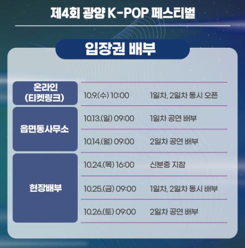 김성수 관광과장은 “티켓 오픈 전부터 입장권 문의가 쇄도하는 등 제4회 광양 K-POP 페스티벌에 대한 관심이 뜨겁다, 시민과 관광객들의 기대에 부응해 철저한 사전 준비로 격조 높은 페스티벌을 만들겠다”라며 향후 배부 일정에 많은 관심과 참여를 당부했다.
