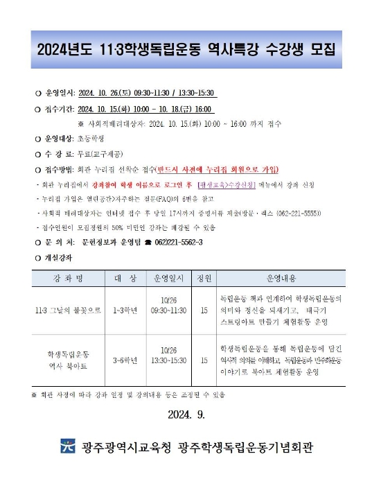광주학생독립운동기념회관 정운용 관장은 “회관의 특성을 살려 역사와 체험활동을 연계한 특강을 준비했다”며 “올바른 역사인식 제고 및 역사에 관한 관심과 흥미를 유발할 수 있도록 다양한 프로그램을 추진하겠다”고 말했다.