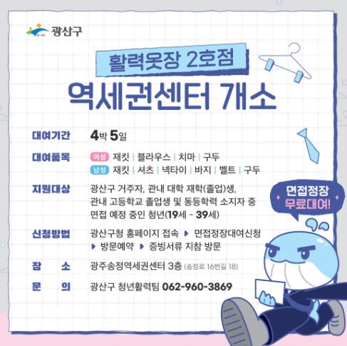 광산구 관계자는 “활력옷장 2호점은 단순히 옷을 대여하는 공간을 넘어 지역사회와 함께하는 청년 지원의 거점으로 자리 잡을 계획이다”며 “더 많은 청년이 성공적으로 사회에 진출할 수 있도록 적극 지원할 예정이다”고 전했다.