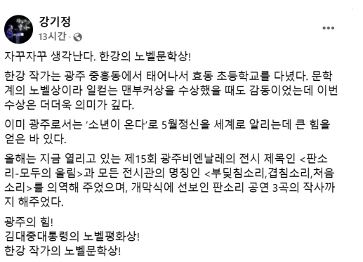 강 시장은 이날 페이스북에 “한강 작가는 광주 중흥동에서 태어나서 효동초등학교를 다녔다”며 “문학계의 노벨상이라 일컫는 맨부커상을 받았을 때도 감동이었는데, 이번 수상은 더더욱 의미가 깊다”고 축하했다.