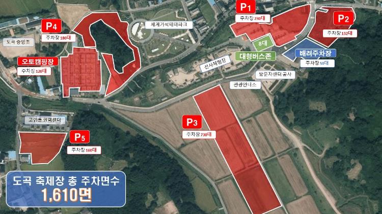 이번 축제에서는 교통 혼잡이 예상되는 주말(토, 일)에 ▲도곡 게이트 인근↔양정마을 사거리 구간에 차량 통제를 실시하고, 7개 주차장에 총 1,885면의 넉넉한 주차 공간을 확보했다.