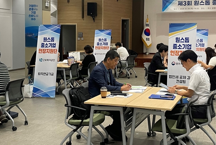 전남도는 또 국세청, 중소벤처기업청, 전남도중소기업일자리경제진흥원, 전남테크노파크, 중소벤처기업진흥공단, 근로복지공단 등 7개 기관이 협력한 ‘중소기업 원스톱 현장지원단’을 중소기업 위기 밀집지역을 중심으로 3회 운영했다. 이를 통해 정부 및 지자체 지원사업, 법인세, 정책자금, 연구개발(R&D), 수출 및 자유무역협정(FTA), 일자리정책, 퇴직연금 등 중소기업 운영에 필수적인 분야의 상담을 진행하고 현장에서 중소기업의 애로사항을 청취했다.