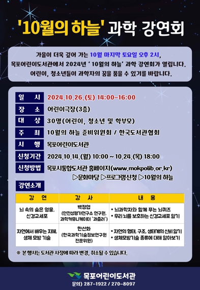 ![]() 목포어린이도서관이 ‘10월의 하늘’ 과학 강연회에 대한 참가접수를 14일부터 시작한다. |