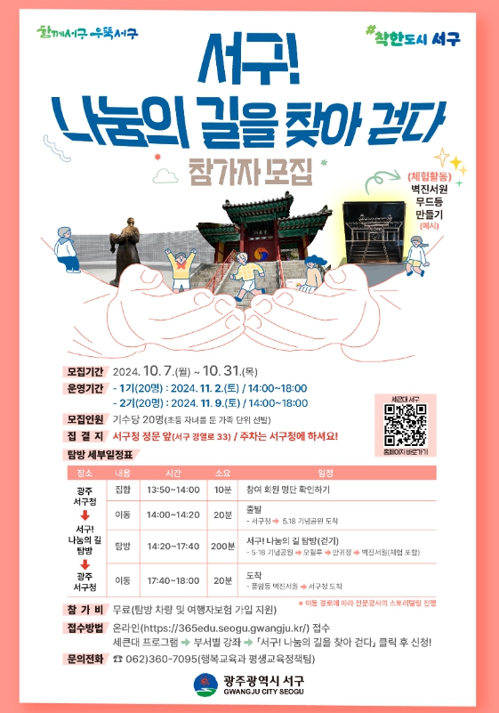 이번 프로그램은 ▲오월항쟁과 광주 시민의 나눔 정신을 배울 수 있는 5·18 기념공원과 오월루 ▲누정(樓亭)과 만드리의 나눔에 대해 이야기 나눌 수 있는 만귀정 ▲회재 박광옥 선생의 노블레스 오블리주 정신과 삶을 배울 수 있는 벽진서원 등을 탐방하며 ‘착한도시 서구’의 나눔과 연대의 가치를 체험해 보는 시간으로 진행된다.