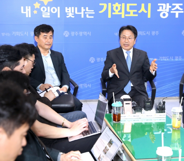 ![]() 강기정 광주광역시장이 14일 오후 시청 5층 기자실에서 출입기자들과 차담회를 갖고 시정 주요현안 등에 대해 설명하고 있다. |