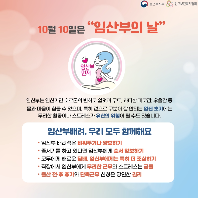 임산부의 날은 2005년에 법정 기념일로 제정되어 매년 10월 10일을 기념하며 올해로 19회를 맞았다.
