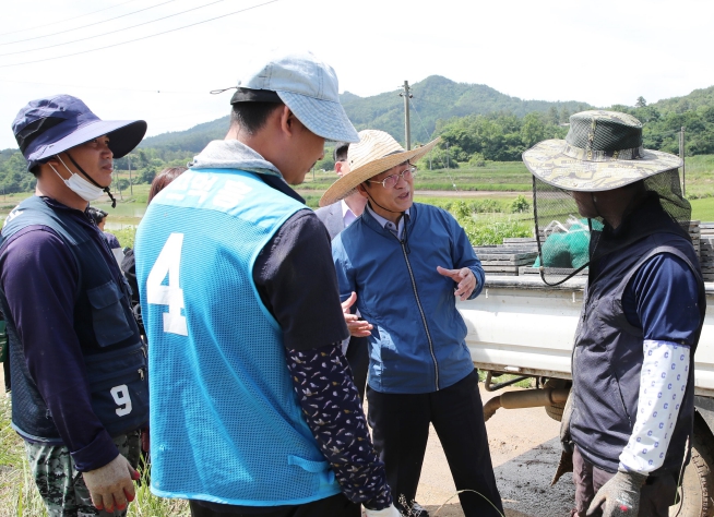 ![]() 진원 강진군수가 외국인 계절근로자들의 작업 현장을 방문해 애로사항을 듣고 향후 계절근로 프로그램 확대 방안에 대해 이야기를 나누고 있다. |