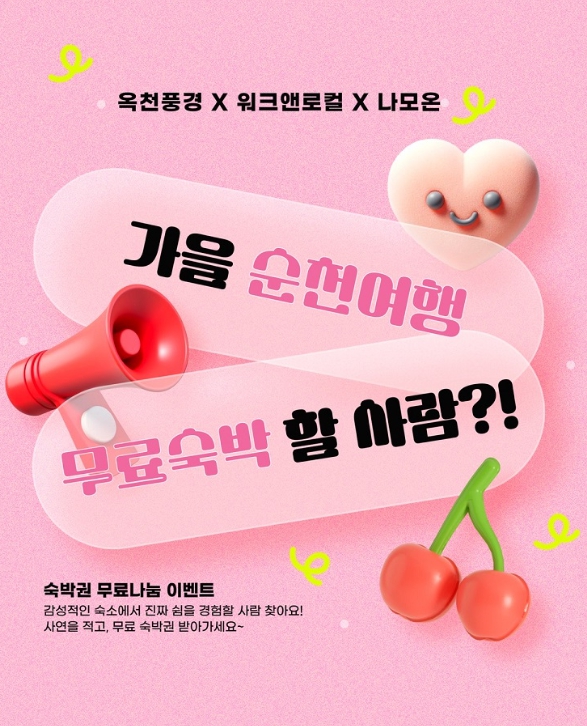 이벤트 참여 방법은 워크앤로컬·옥천풍경·나모온의 인스타그램 계정을 팔로우하고, ‘향동 소재 한옥펜션에서 하룻밤을 보내고 싶은 이유'를 댓글로 남긴 후 친구를 태그하면 응모가 완료된다.