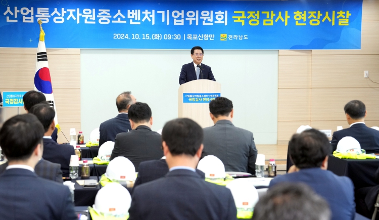 ![]() 김영록 전라남도지사가 15일 목포신항 배후부지에서 열린 국회 산업통상자원중소벤처기업위원회 국정감사 현장시찰 설명회에서 인사말을 하고 있다. |