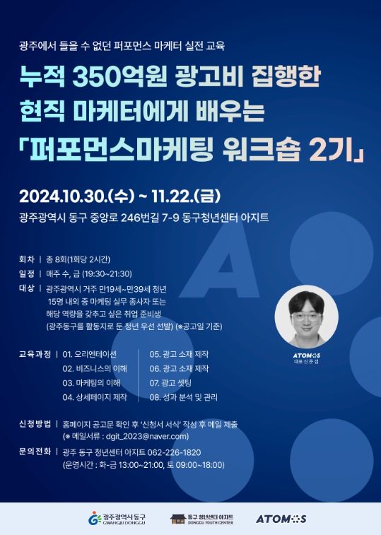 워크숍에서는 마케팅 전문기업 ‘아토모스’ 신준섭 대표가 강사로 나서 비즈니스의 이해, 마케팅의 이해, 광고 소재 제작, 성과분석 및 관리 등에 대해 이야기할 예정이다.