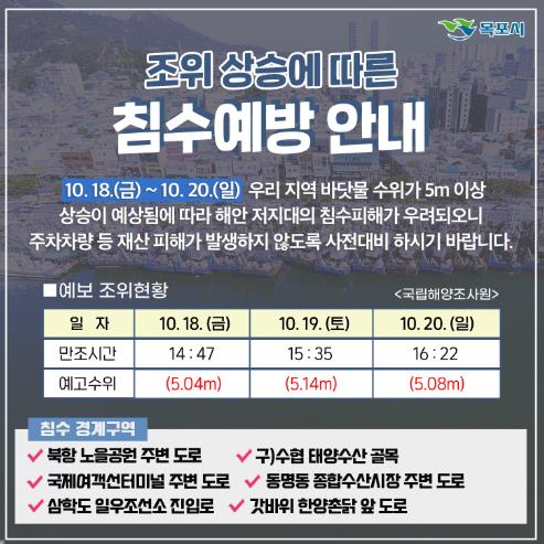 한편, 목포시는 바닷물 수위가 조석표상 조고 4.90m이상일 경우 해수 위험일로 지정해 시민들의 재산피해가 발생하지 않도록 침수피해 예방에 적극 대처하고 있다.