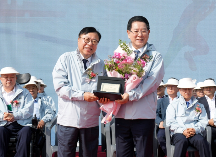 ![]() 김영록 전라남도지사가 16일 나주종합스포츠파크 종합운동장에서 열린 ‘제13회 전국지체장애인체육대회’에서 황재연 한국지체장애인협회 중앙회장으로부터 감사패를 받고 기념촬영을 하고 있다. |