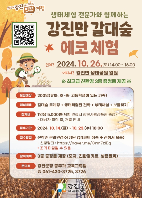 이번 행사는 생태체험 전문가와 함께하는 강진만 갈대숲 에코 체험으로, 유아 및 초·중·고등학생이 있는 가족 200명을 대상으로 진행된다.