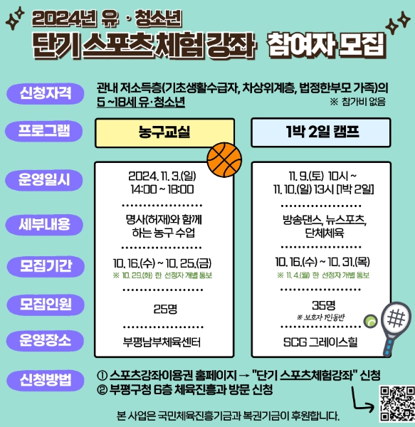 농구교실은 부평남부체육센터에서 진행되며, 스포츠체험 캠프는 인천 강화군 소재 SCG 그레이스힐에서 방송댄스·단체체육 등을 진행할 예정이다.