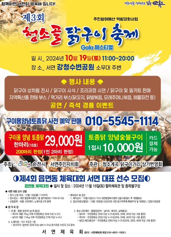 이번 행사는 서면 주민자치회와 청소계곡 닭구이거리 상가 번영회의 공동 주관으로 진행된다.