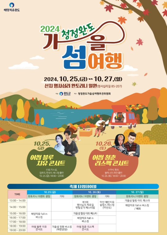 군 관계자는 “청정완도에서만 느낄 수 있는 가을의 정취와 해양치유, 산림치유 등을 통해 바쁜 일상 속 치유하는 시간을 가져보시길 바란다”라고 전했다.