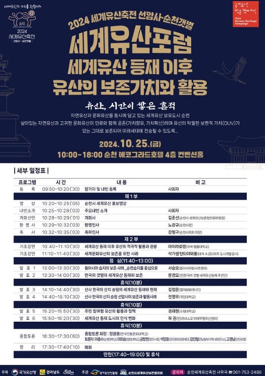 이번 포럼은 연일 열기를 더해 가는 ‘2024 순천 세계유산축전’의 가치를 알리는 학술행사로 개최되며, 「선암사․순천갯벌의 세계유산 등재 이후 유산의 가치 보존과 활용」이라는 주제로 진행된다.