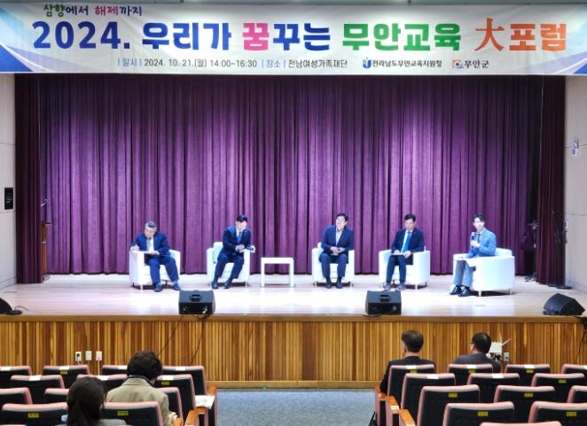 '2024. 무안교육 대포럼'은 무안교육 혁신과 지역인재 양성 및 정주를 이끌어 내는 교육발전특구 사업의 공감대를 형성하고 추진력을 확보하기 위해 무안교육지원청의 주관으로 실시한 행사로, 이날 행사에는 학부모와 지역주민 등 무안 교육가족 약 150여 명이 참여해 열띤 강연과 함께 참석자와의 대담이 이어졌다.