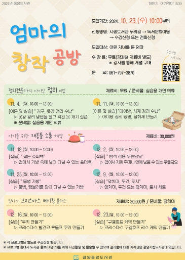 ![]() 광양중앙도서관, ‘엄마의 창작 공방’ 수강생 모집 |