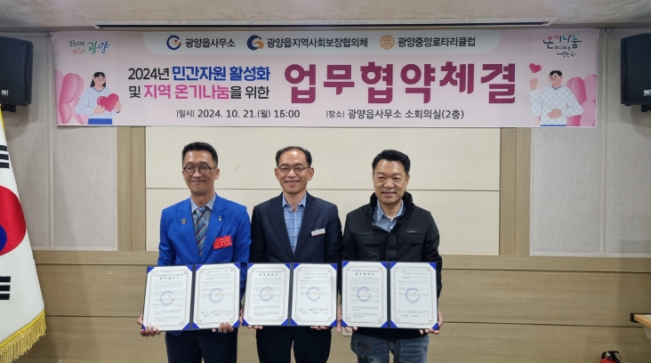 광양읍은 복지 사각지대에 놓인 취약계층의 일상 회복과 지역사회에 온기 나눔 문화확산을 목적으로 광양중앙로타리클럽과의 협력을 강화하기 위해 업무협약을 체결했다.