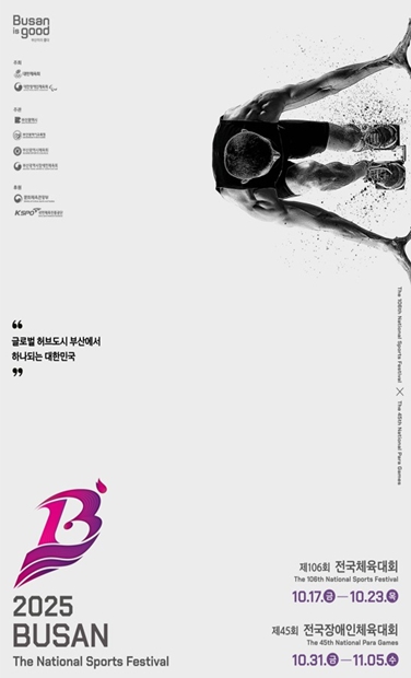 ‘2025 전국(장애인)체전’의 비전과 열정을 상징하는 성화를 상단에, 부산의 푸른 바다를 상징하는 물결을 하단에 배치하고 가운데 흰색의 여백을 통해 ‘제106회 전국체육대회’를 표현했다.