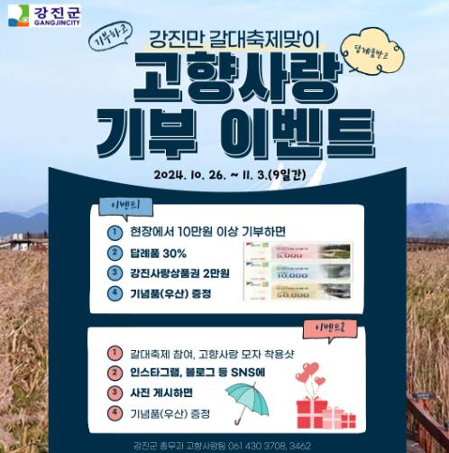 고향사랑기부제 이벤트는 행사장 내 부스에서 진행되며, 기존 3만 원 상당의 답례품에 더해 강진사랑상품권 2만 원과 우산 등 추가 기념품을 증정하는 현장 기부 이벤트와 SNS 인증 이벤트 등 참여자에게 풍성한 혜택이 제공될 예정이다.