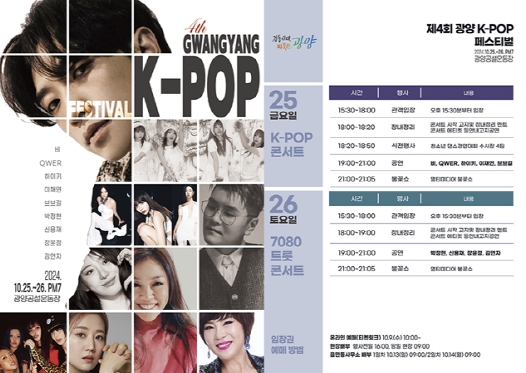 글로벌 관광축제 제4회 광양 K-POP 페스티벌이 이틀 앞으로 다가왔다. 올해로 4회를 맞는 광양 K-POP 페스티벌은 첫날인 25일은 비, QWER, 하이키, 이채연, 브브걸, 26일은 박정현, 신용재, 장윤정, 김연자 등이 대거 출동한다.