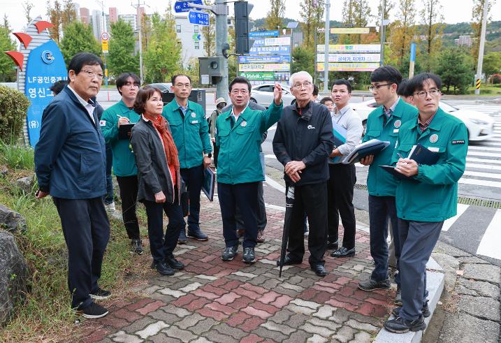 현장을 찾은 정인화 시장은 민원인을 만나 이야기를 청취한 후 보행자 통행 환경을 살피고 도로 건너편 옹벽의 전도 위험 여부를 점검했다.