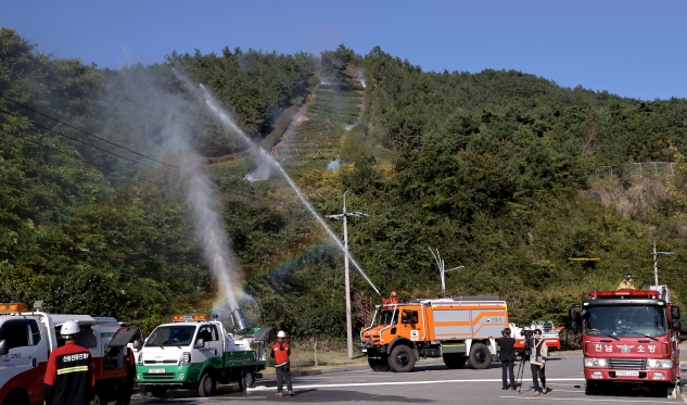 훈련은 산불이 가장 많이 발생하는 3~4월, 주요 발생 원인인 영농부산물 소각으로 대형산불이 발생했을 때를 가상해 진화 인력 및 자원 동원, 산불현장지휘본부 구성·운영, 지상진화, 공중진화 등 실전처럼 이뤄졌다.