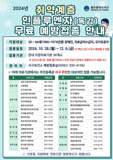 ![]() 광주광역시 서구, 성인 취약계층 대상 무료 독감 예방접종 |