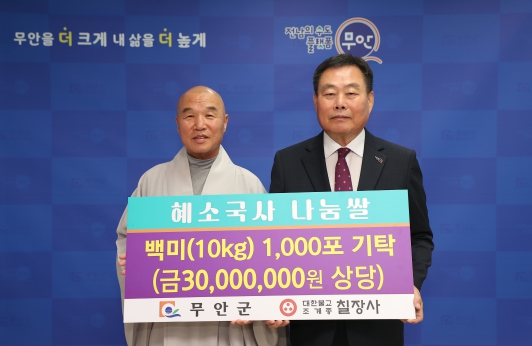 무안군에는 지난해에도 운남면에 소재한 혜운사에서 청화대종사 탄신 100주년을 기념하는 행사를 통해 나눔 쌀 800포를 기탁한 바 있다.
