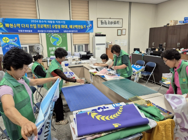 이에 장흥군새마을부녀회는 폐현수막 재활용에 관심을 갖고 장흥군옥외광고협회의 협조로 버려질 위기에 놓인 폐현수막을 수거하여 분류 작업을 통해 일부를 수해 방지용 모래주머니로 활용될 수방용 마대, 에코백, 농업용 화분으로 재탄생 시켰다.