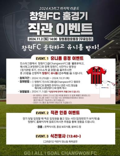 10월 25일부터 31일까지 인스타그램에서 창원FC를 팔로우하고, 해시태그(#창원FC)와 함께 창원FC 경기관람 후기와 선수 소개 등의 글과 함께 사진 또는 동영상을 게시하면 20명을 선정하여 선수 실착 유니폼을 증정한다.
