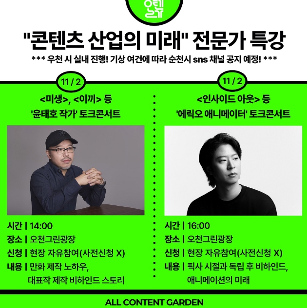 노관규 순천시장은 “잘 가꿔온 생태자원 위에 웹툰, 애니메이션 등 문화콘텐츠를 도시 곳곳에서 경험하고 느낄 수 있도록 이번 행사를 준비했다”며 “특히 예비 작가, 예비 애니메이터로서 순천에 오면 다양한 기회를 접하고, 배우고, 꿈을 키워갈 수 있도록 문화산업의 뿌리를 깊숙이 다지겠다”고 말했다.
