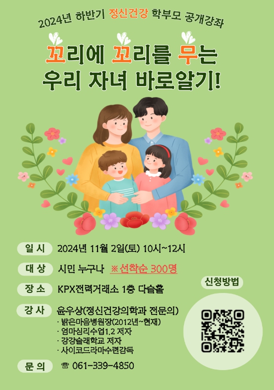 ![]() 2024년 학부모 공개강좌 ‘꼬리에 꼬리를 무는 우리 자녀 바로알기!’ 포스터. |