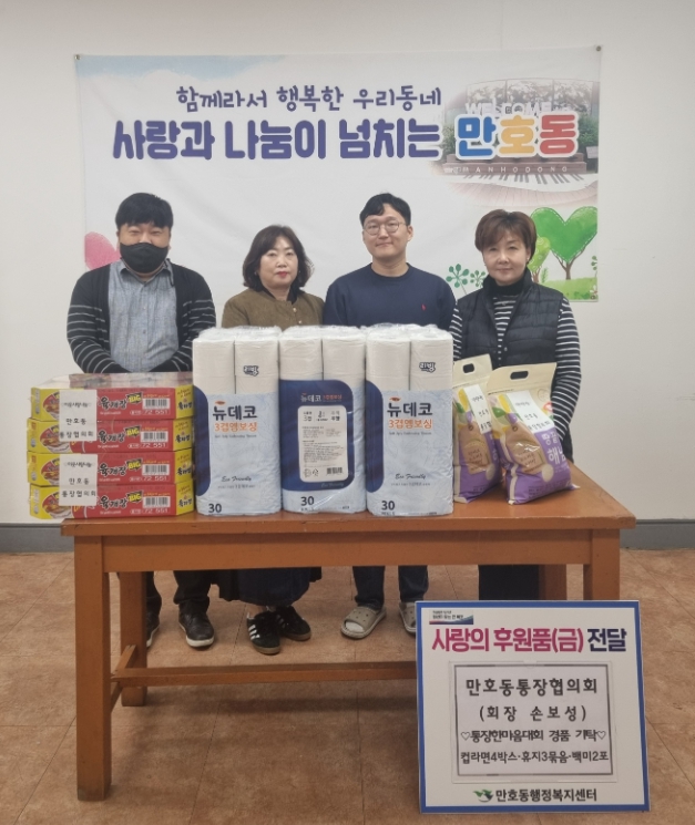 김광미 만호동장은 “이웃을 먼저 살피고 변함없는 손길을 내밀어 주신 후원자들께 감사드리고, 동에서도 도움이 필요한 세대를 살피고 지원하기 위해 다방면으로 노력하겠다 ”고 말했다.