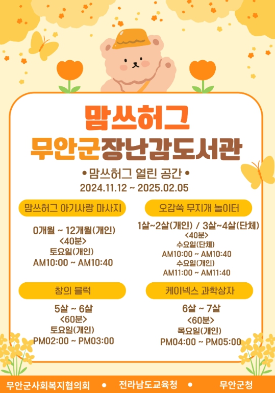 군은 무안군교육지원청에서 지역사회연계 영유아 프로그램 사업비 15백만원을 지원받아 ▲맘쓰허그 아기사랑 마사지 ▲오감쑥 무지개 놀이터 ▲창의블럭 ▲케이넥스 과학상자 등의 프로그램을 2024년 11월 12일부터 2025년 2월 5일까지 운영한다.