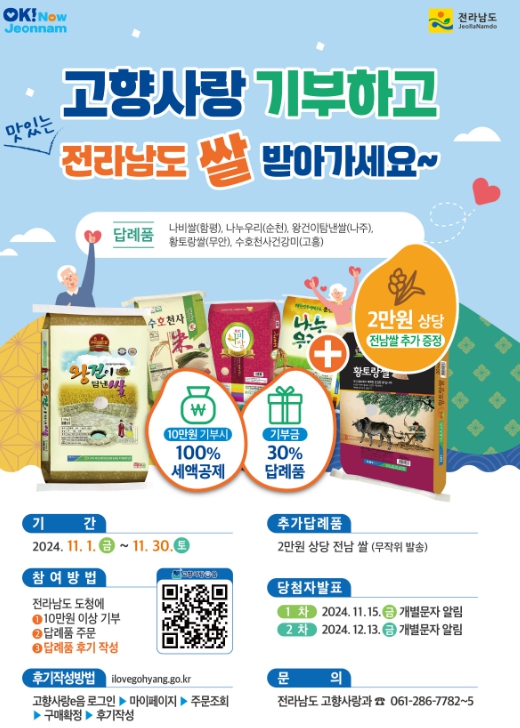 강경문 전남도 고향사랑과장은 “연말 고향사랑 기부를 실천하고 보다 뜻깊게 보내길 바란다”며 “이번 이벤트가 전남 쌀 소비 촉진으로 이어져 전남 농가에도 실질적 도움이 되길 기대한다”고 말했다.