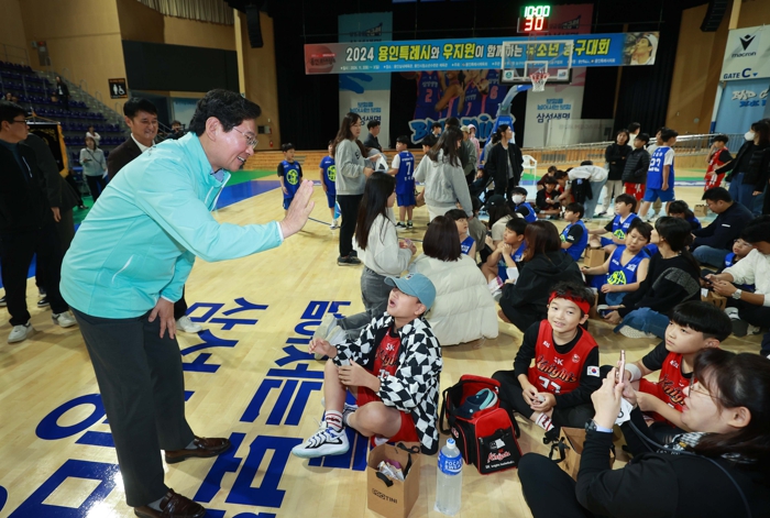 ![]() 용인특례시와 우지원이 함께하는 유소년농구대회에 참가한 선수들을 격려하고 있는 이상일 시장의 모습 |